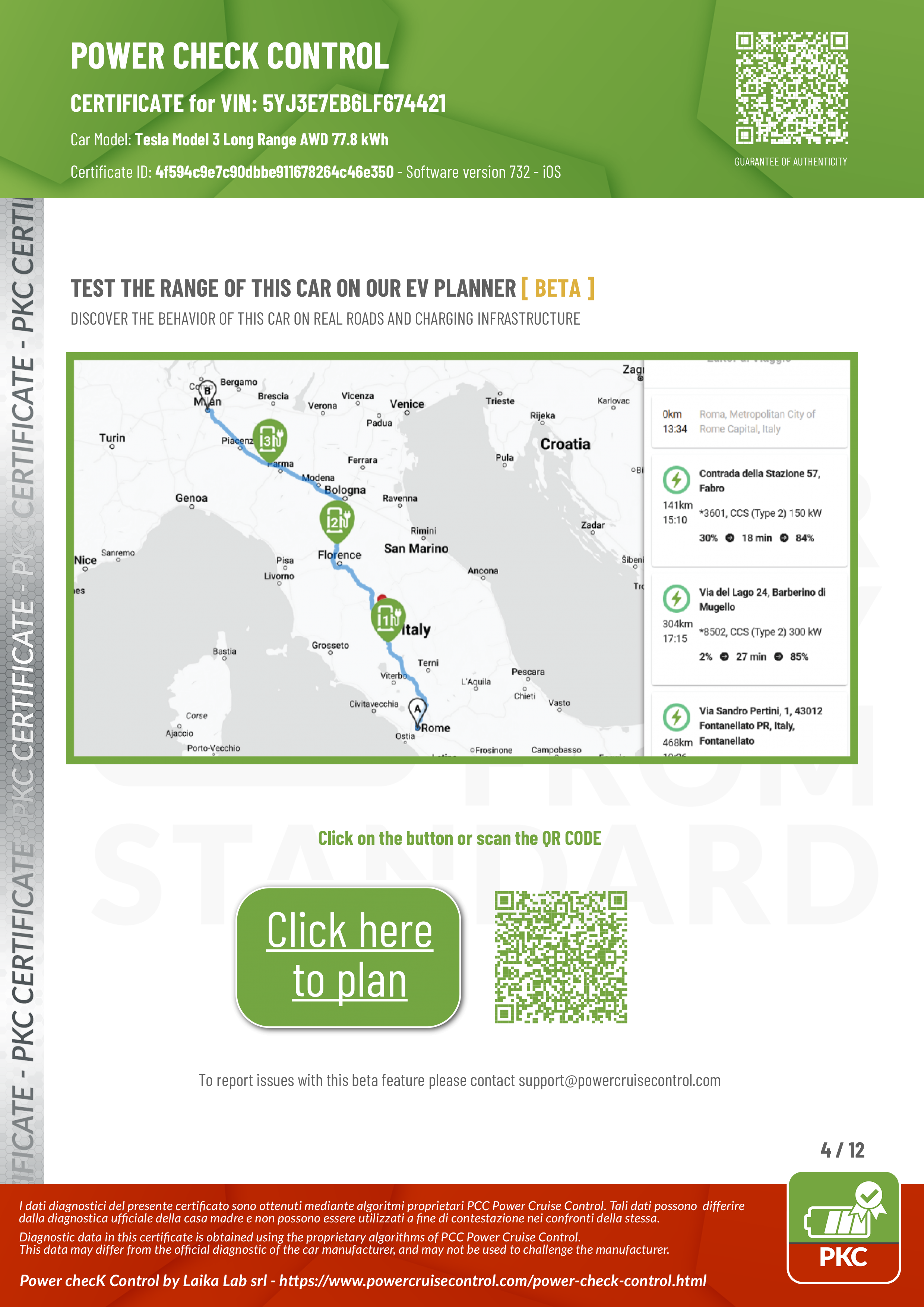 PKC certificates have a dedicated link to our Web EV Trip Planner, where you can test any trip you wish using the data of the certified vehicle. Click here for a demo version!